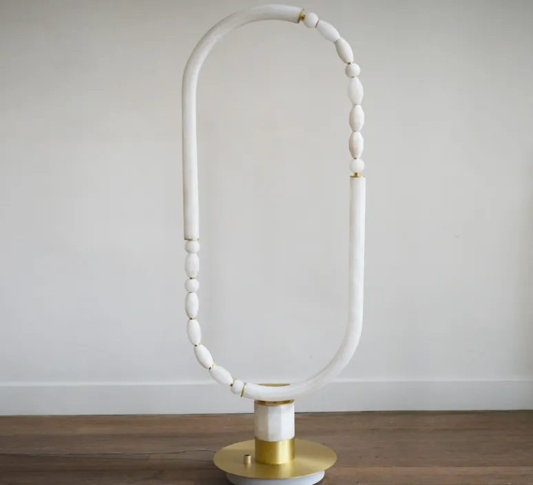 Conçue par Julie Schouvey, cette collection explore l’équilibre et la légèreté à travers des formes asymétriques. En utilisant des matériaux nobles comme l’albâtre et le laiton, les pièces sont sculptées de manière fine et aérienne, avec des lignes à la fois courbes et anguleuses. La lumière filtrant à travers l’albâtre accentue l’impression de légèreté, malgré la densité des matériaux.