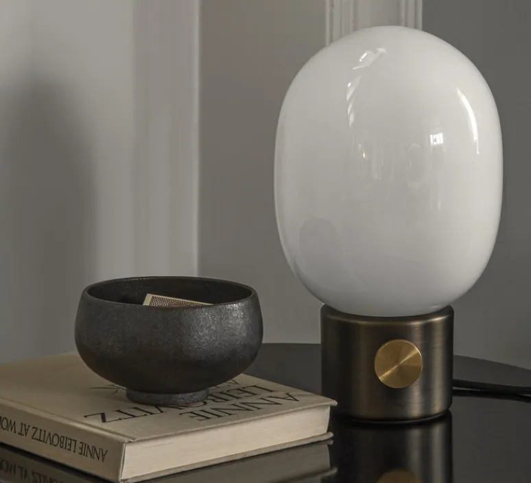 Composée d’une base en métal brossé de couleur laiton bronzé et d’un abat-jour en verre opalin soufflé à la bouche, la lampe de table JWDA possède aussi un gradateur permettant de varier la lumière selon votre envie.