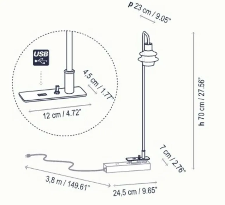 La lampe mesure 70cm de hauteur et 24,5cm longueur, 23cm de profondeur.
