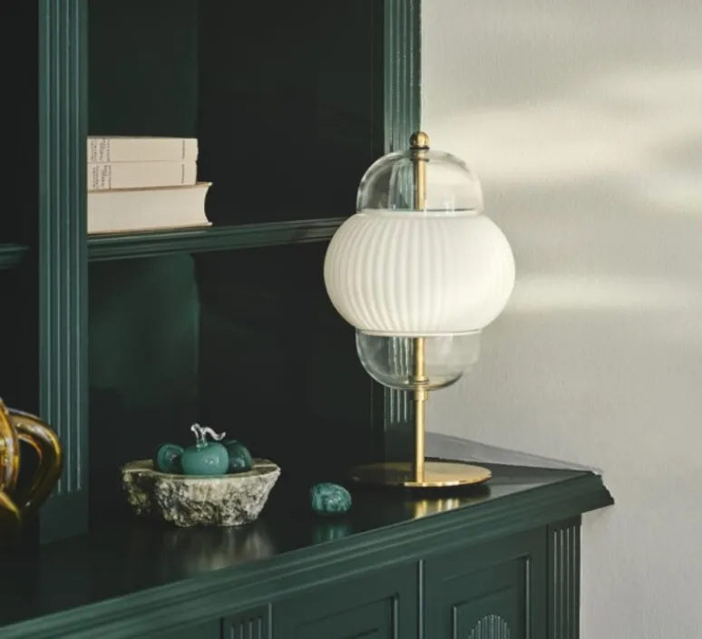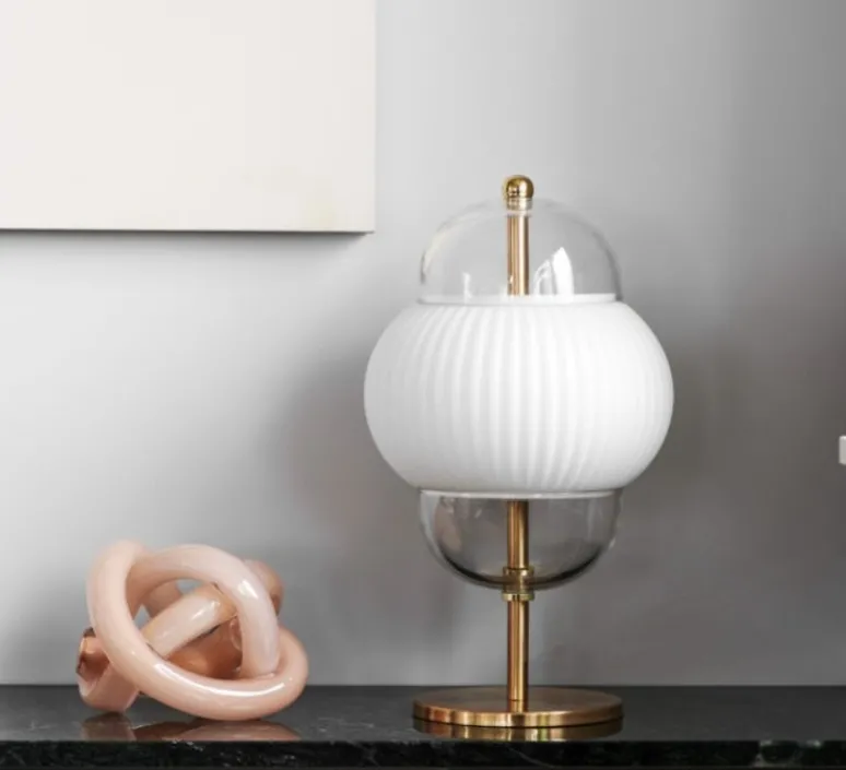Voici la lampe à poser Shahin de couleur opale, dorée et transparent du studio danois Design by us !