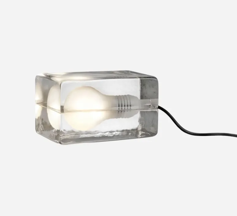 Cette lampe conçue à partir d’un bloc en verre contient une ampoule E14.