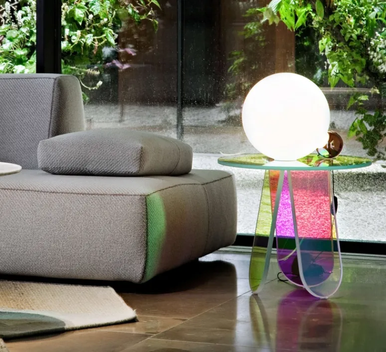 Composée d’une sphère en aluminium plongée dans un bain d’or et d’une seconde sphère plus large en verre soufflé, ce luminaire offre un charme discret. Cette association asymétrique assure la stabilité de la lampe.