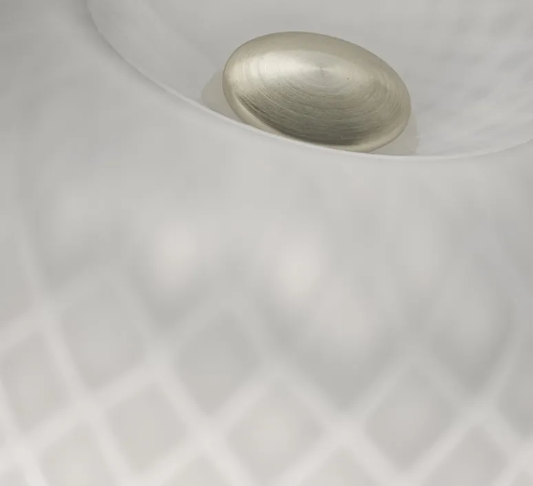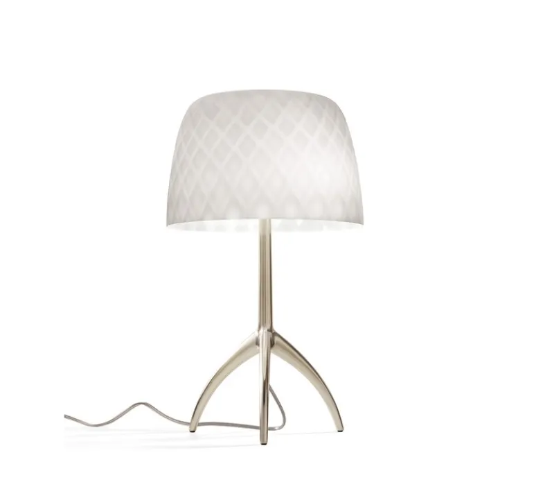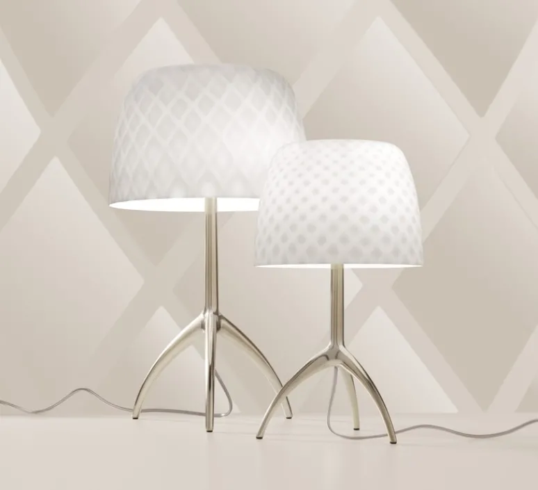 Le luminaire Lumiere Grande 30th est composé d’une structure en métal à trois pieds, sur laquelle est posé un abat-jour en verre soufflé. Icône du design, Lumiere Grande fête son 30ème anniversaire en se parant d’une nouvelle élégance : pied couleur champagne, abat-jour blanc à motif « bulles » ou « pastilles ». Parfait équilibre entre verre et métal, entre tradition et innovation, entre décoration et technique, entre chaud et froid, Lumiere continue de se faire une place dans l’Histoire du design. Lumiere Grande 30th diffuse une lumière directe et diffuse, chaleureuse et intense. Eteinte, elle exprime une élégance raffinée ; allumée, sa lumière exalte chaque détail du diffuseur en verre. Lumiere Grande 30th est parfaite pour toute occasion, que ce soit sur la table de chevet d’un particulier ou dans le décor d’un grand hôtel.