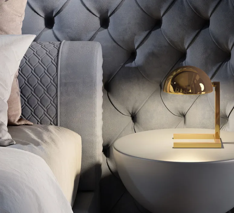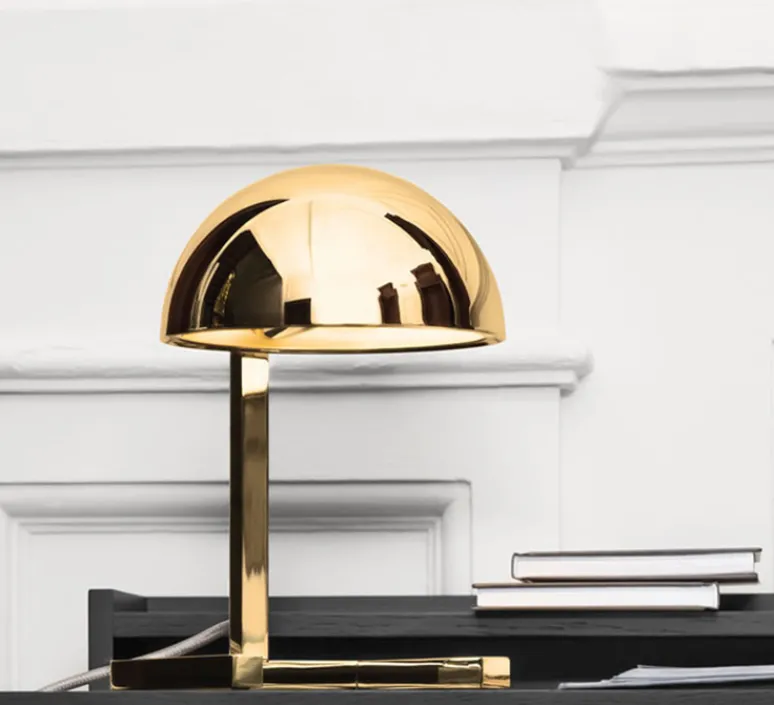 La lampe MJA est en laiton avec une finition or, elle se compose d’une calotte appuyée sur une structure quadrangulaire qui sert de base.