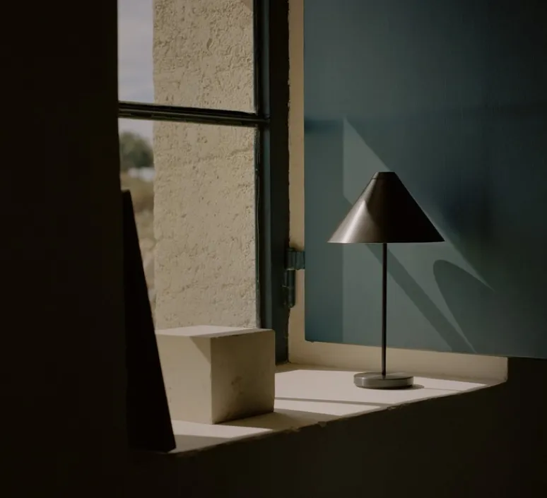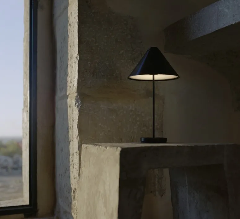 Brolly est une baladeuse et lampe de table en acier brossé à l’allure simple et minimaliste. La forme conique géométrique de l’abat-jour en acier associée à la tige délicate de la base font de la baladeuse un objet de décoration à part entière.