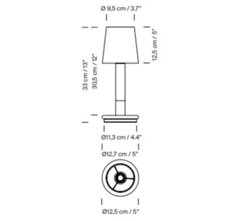 La baladeuse mesure 12,5 cm de diamètre et 33 cm de hauteur. La source lumineuse 2200K, 31lm est fournie.