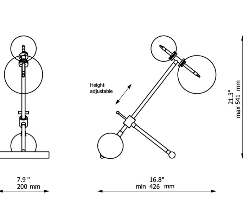 Existant en laiton de trois finitions différentes (laiton laqué bruni, gris acier, nickel poli), elle est conçue en laiton et se compose de globes en verre soufflé à la main.