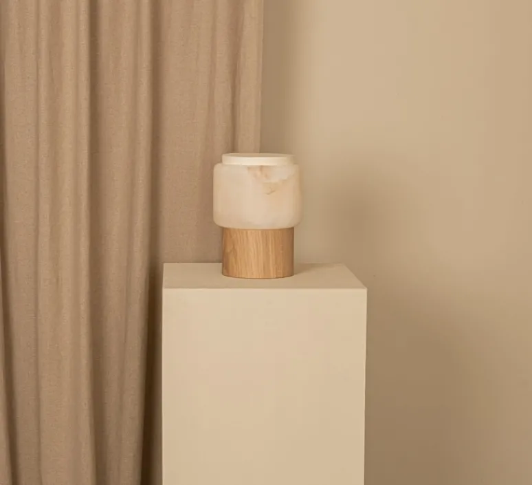 Découvrez la lampe à poser Lanterno, une création signée Simone & Marcel, présentant une alliance raffinée entre l’albâtre et le chêne.