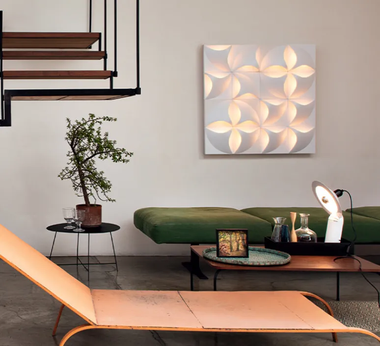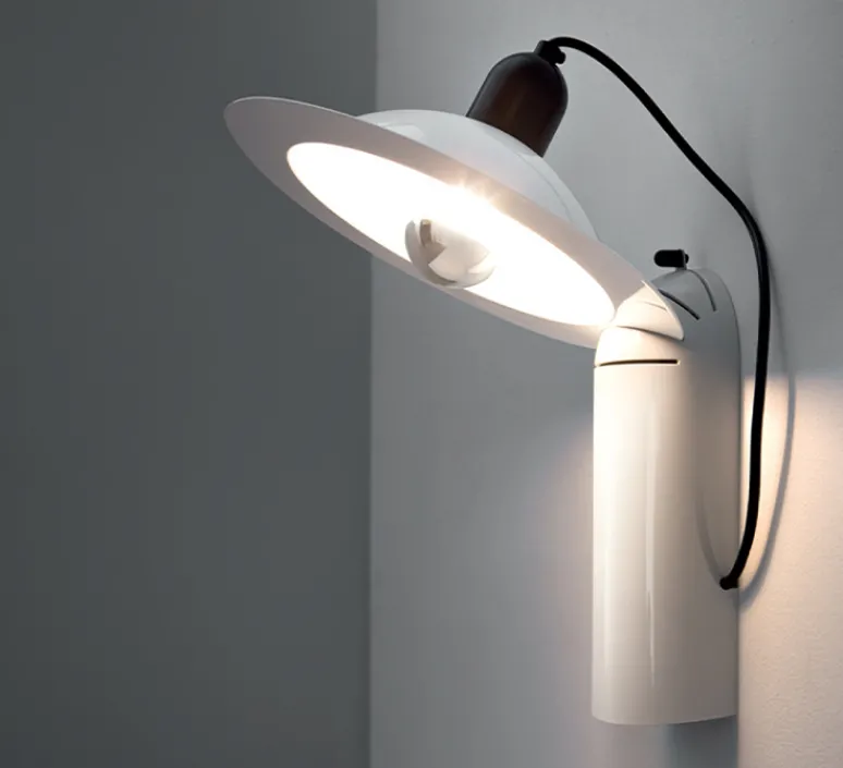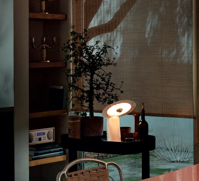 Le luminaire Lampiatta est composé d’une base en métal, d’un corps en polycarbonate tel la surface d’une colonne se terminant par un hémisphère coupé en deux, dans laquelle quatre fentes permettent de glisser un abat-jour en aluminium prenant la forme d’un casque anglais Brodie avec câble intégrant l’interrupteur. Chaque encoche permet, d’un simple mouvement de la main, une inclination de la lumière différente, directement ou indirectement. En enlevant la base métallique, le luminaire peut également s’utiliser en applique murale. Versatile et impertinente, Lampiatta s’installe facilement dans chaque intérieur, que ce soit une chambre au style maximaliste ou un salon au style minimaliste.