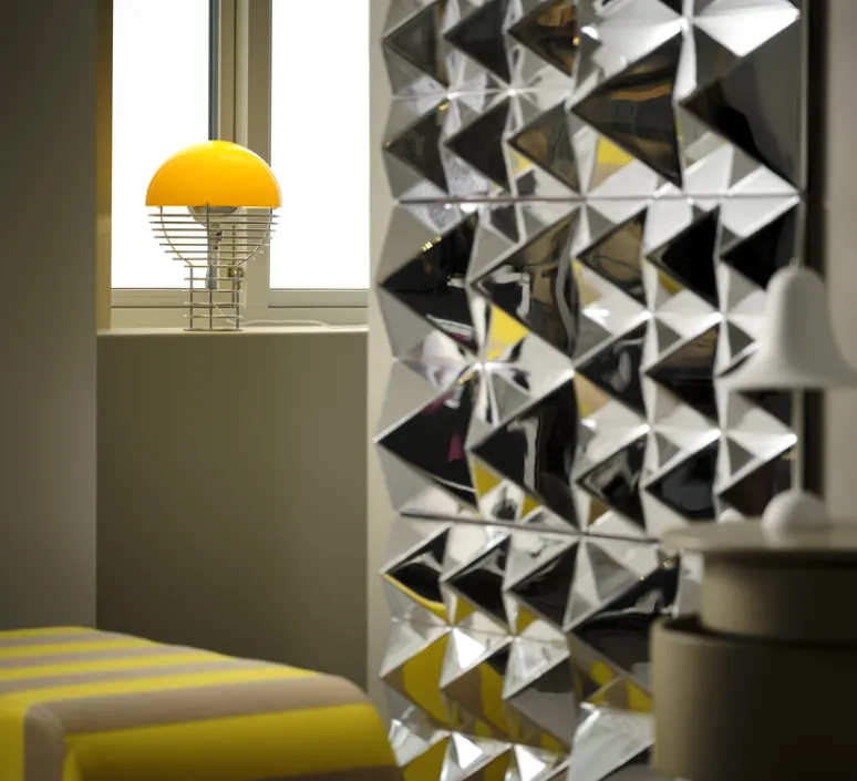 Découvrez la fameuse lampe à poser Wire en finition jaune, dessinée par Verner Panton.