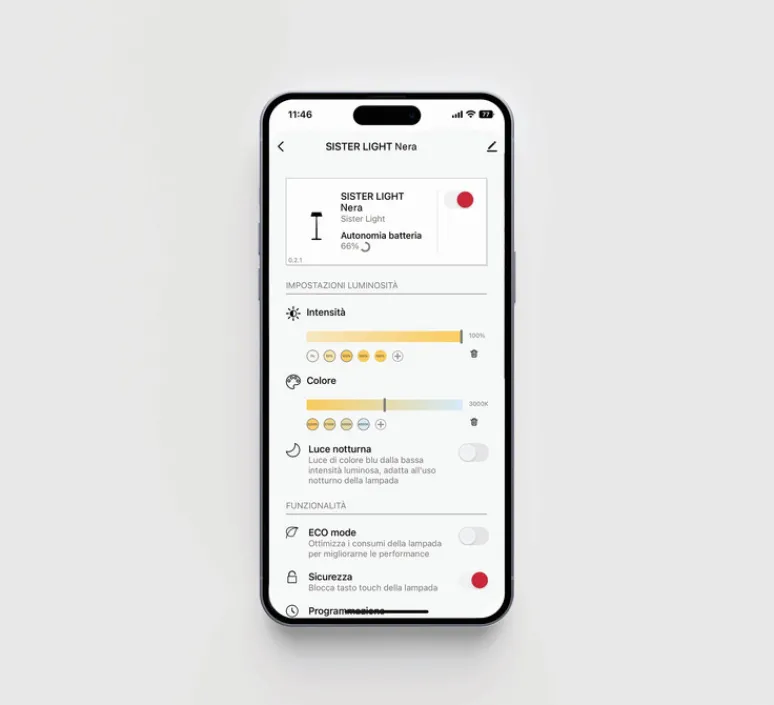 La lampe Sister Light mesure Ø13,2 cm de diamètre pour 32,8 cm de hauteur. Elle est équipée d’une source LED incluse, avec un éclairage direct à un angle de 180° et une luminosité ajustable entre 250 et 338 lumens. Sa batterie rechargeable assure une utilisation pratique et autonome, et peut être contrôlée à distance via l’application Zafferano Lighting. La lampe dispose également d’un système de contrôle électronique, optimisant l’autonomie et garantissant un flux lumineux constant jusqu’à l’épuisement de la batterie.