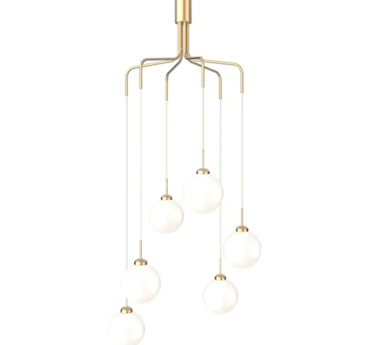 Ce lustre Cluster est composé d’une série d’orbes en verre blanc opale soufflé à la main, suspendus à des tiges en métal massif avec une finition en laiton satiné. Cette combinaison de matériaux et de textures crée un contraste visuel intéressant, associant la douceur du verre opale à la robustesse du métal massif.