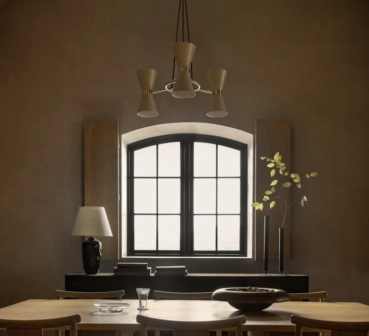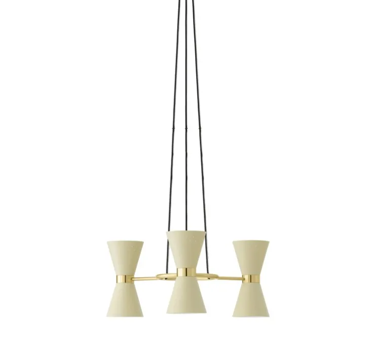 Conçue dans les années 1950 cette suspension séduit par son modernisme et son élégance. En finition laiton et aluminium ce luminaire est composé de trois abat-jour conique laissant s’échapper une lumière douce et chaleureuse.