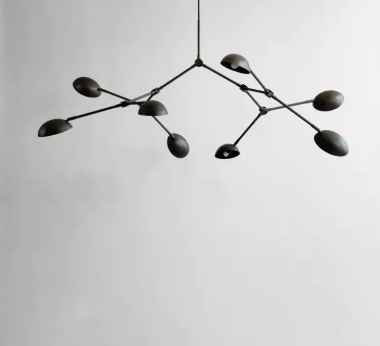 Les abat-jours légèrement incurvés et les 14 bras réglables, flexibles et fonctionnels de ce lustre offrent d’innombrables options, variations et angles. Chaque élément est soigneusement pensé pour créer une esthétique harmonieuse et une fonctionnalité exceptionnelle. Le corps du lustre est réalisé en métal oxydé et plaqué, puis brossé à la main, ce qui confère à la pièce une finition magnifiquement travaillée et une allure unique.