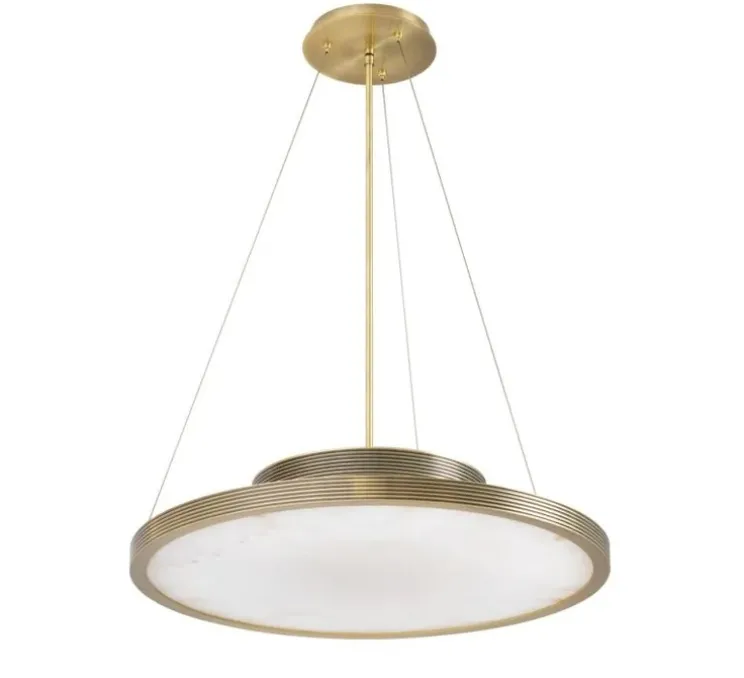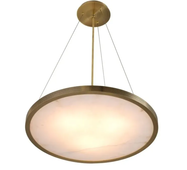 Son esthétique saisissante séduit par sa finition en laiton brossé et ses lignes gravées qui évoquent l’élégance des quartiers chics de New York. Doté d’un abat-jour plat en albâtre, ce lustre circulaire suspendu crée une ambiance chaleureuse et sophistiquée. Pour une décoration réussie, placez-le avec soin dans un hall d’entrée ou au-dessus d’une table à manger pour un effet spectaculaire.