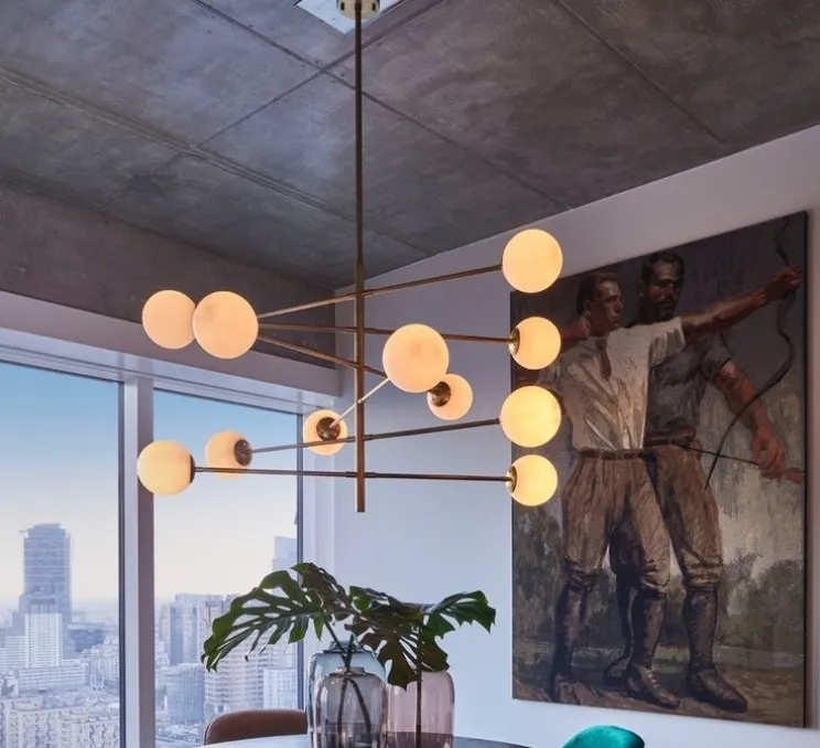 Cette réinterprétation asymétrique d’un design moderne du milieu du siècle rehaussera instantanément le style de votre pièce. Agrémenté d’une finition laiton antique, ce plafonnier possède 12 globes en verre blanc.