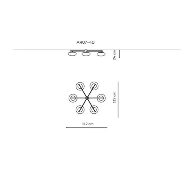 La plafonnier 6 Lune mesure 112cm de diamètre et 24cm de hauteur. Le luminaire possède 6 lampes en verre soufflé avec une puissance de 15W chacune, une température de couleurs de 2700K et une intensité lumineuse 6*806lm. Driver inclus et dimmanche en coupure de phase.