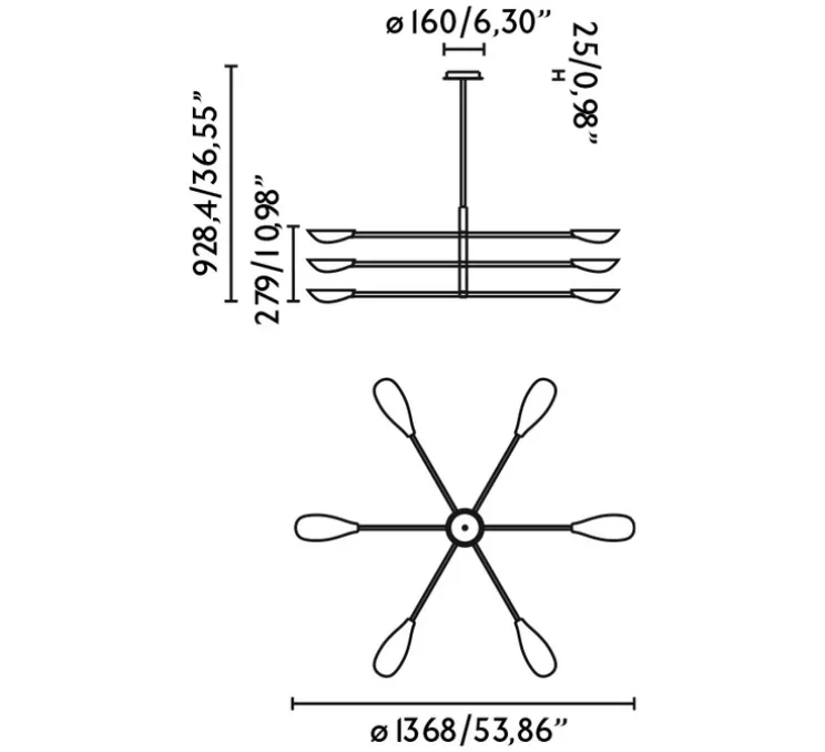 Il mesure 136,8cm de diamètre et 27,9cm de hauteur. Le réflecteur orientable permet d’ajuster la direction de la lumière selon les besoins spécifiques de chaque espace et ainsi obtenir un éclairage direct ou indirect : orientation horizontale de 350° et orientation verticale de 90°. Bien que la source lumineuse ne soit pas incluse, le plafonnier Liggera doit être associé à six ampoules G9 Led d’une puissance maximale de 6W chacune pour une luminosité optimale.