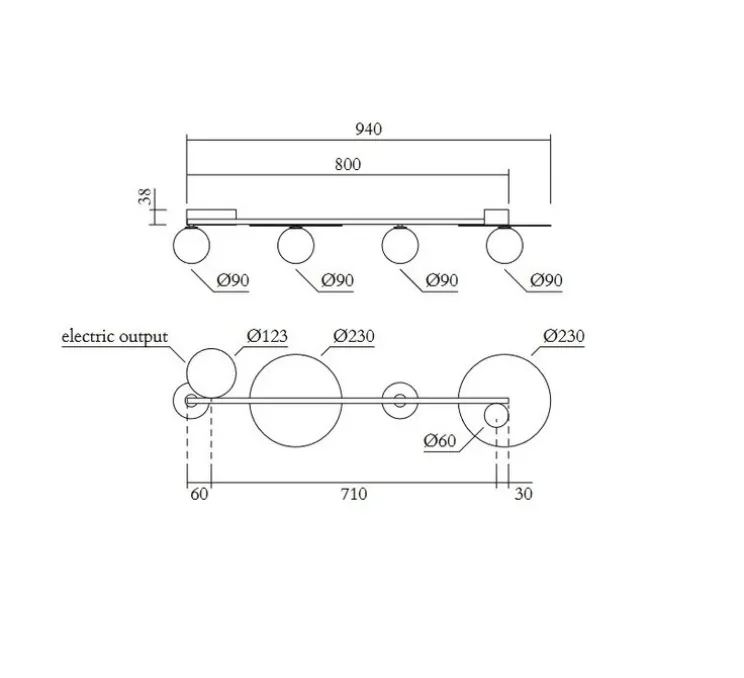 Doté d’une longueur de 71 cm et d’une hauteur de 3,8 cm, le plafonnier Line, Globes and Discs 320 offre un éclairage diffus à 360 degrés. Nous vous recommandons 4 ampoules LED G9 de 5W Max.
