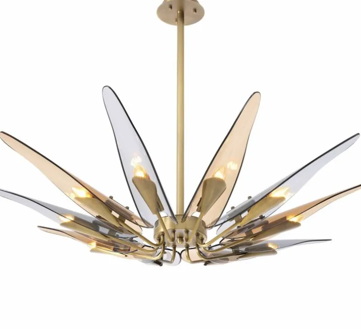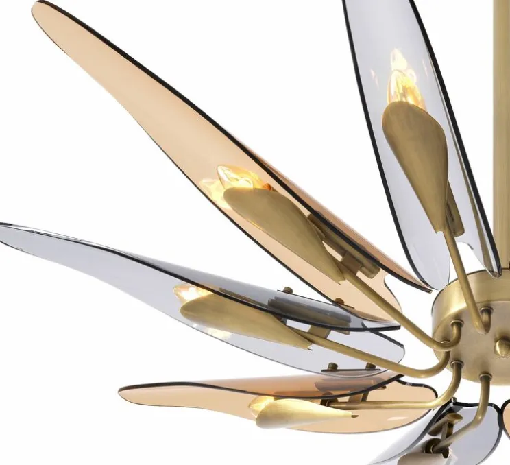 Il se distingue par sa magnifique forme florale. Doté d’une finition en laiton antique, ce magnifique plafonnier est suspendu à une tige et à un baldaquin assorti. Le luminaire comprend 10 pétales de fleurs en verre fumé et 10 en verre ambré translucide.