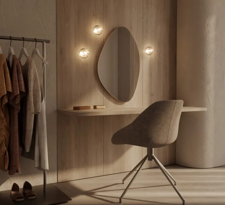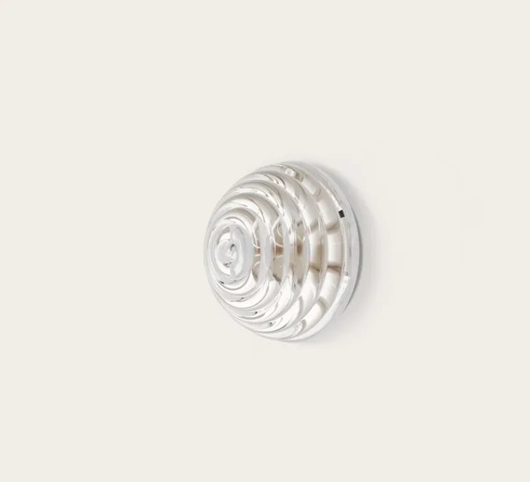 Hado se distingue par son diffuseur en verre transparent strié de forme conique, qui crée un jeu de lumière délicat tout en offrant une grande légèreté visuelle. Ce modèle peut être installé aussi bien au mur qu’au plafond, seul ou en série, dans un couloir, une salle de bain ou une chambre, où il apporte une touche décorative subtile et minérale.