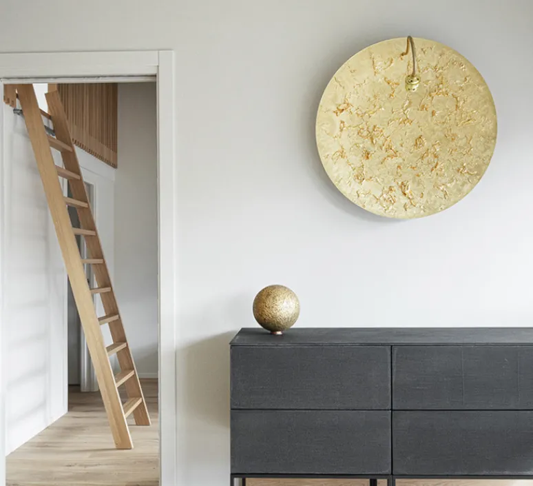 Luna Piena 80 se distingue par sa forme circulaire imposante de 80 cm de diamètre, recouverte de feuilles d’or, qui diffuse une lumière indirecte douce et enveloppante. Le tube flexible qui compose cette œuvre lumineuse permet de moduler sa forme, offrant ainsi une personnalisation du rendu lumineux et esthétique. Son éclat doré apporte une touche élégante et raffinée aux intérieurs contemporains. Ce luminaire s’intègre aussi bien au plafond qu’au mur, et il se marie particulièrement bien avec des matériaux naturels et des palettes de couleurs neutres pour créer un contraste saisissant.
