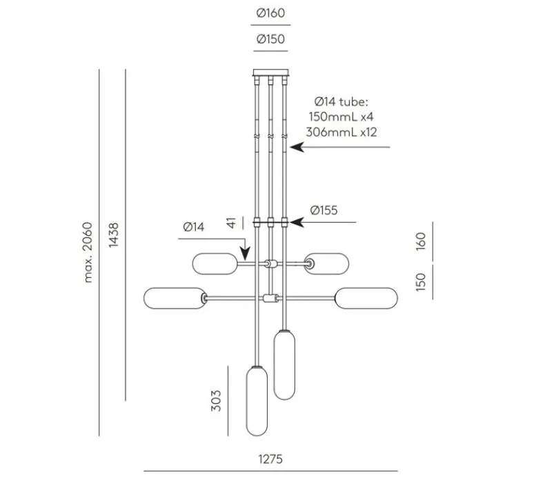 Ce plafonnier mesure 127,5 cm de diamètre et 206 cm de hauteur. Sa source lumineuse (6 x G9) est incluse.
