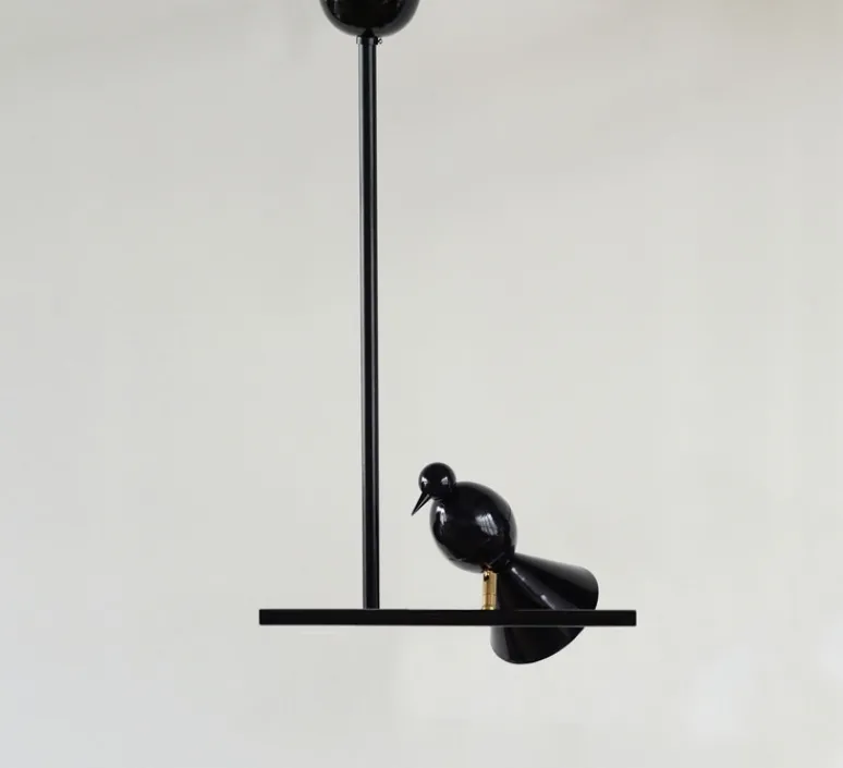 Le plafonnier se compose d’une structure sur laquelle repose un oiseau noir articulé qui permet d’orienter la lumière dans différentes directions voulues.