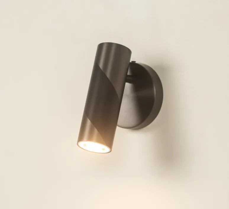 Réduit à l’essentiel, le design du spot repose sur un tube de graphite satiné, subtilement animé par un motif laqué en spirale évoquant un sucre d’orge. Cette ornementation apporte une touche ludique à la rigueur formelle du métal, créant un contraste délicat entre technicité et fantaisie. Orientable, ce spot se place en solo ou en série, dans un couloir, une niche ou un espace de lecture pour accentuer les volumes.