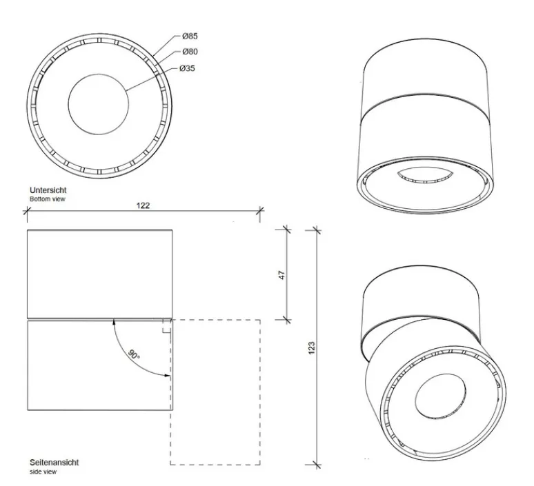 Son design cylindrique orientable permet une installation en plafonnier ou en applique murale, selon les besoins d’éclairage ciblé.
