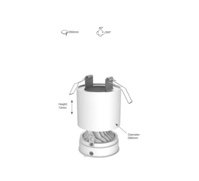Ce luminaire est équipé d’un module LED qui diffuse une lumière de 3000K et 1156lm. Il mesure 7,2 cm de hauteur et 8 cm de diamètre. Nous préconisons une hauteur de 5 cm pour le faux plafond afin d’installer confortablement ce spot.