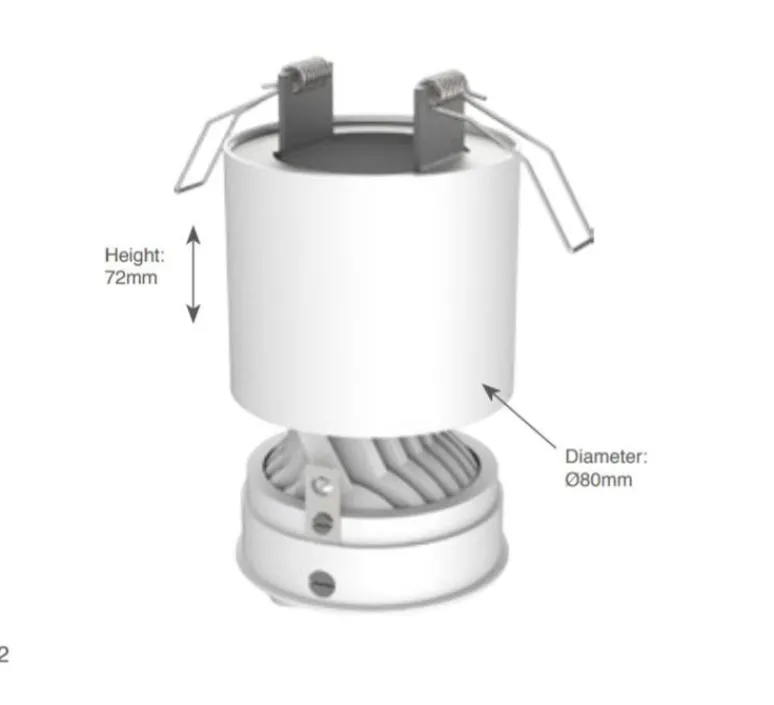 Ce luminaire est équipé d’un module LED qui diffuse une lumière de 2700K et 1100lm. Il mesure 7,2 cm de hauteur et 8 cm de diamètre. Nous préconisons une hauteur de 5 cm pour le faux plafond afin d’installer confortablement ce spot.