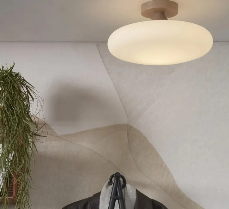 Ce plafonnier mesure 34cm de diamètre et 19cm de hauteur. Il est parfait pour illuminer votre espace de manière diffuse à 360 degrés. Sa source lumineuse n’est pas incluse.