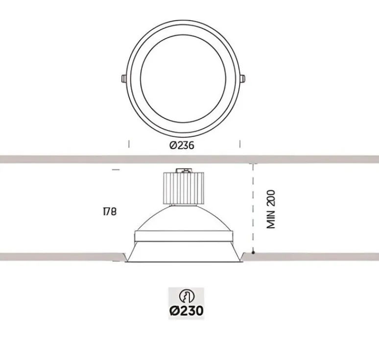 Encastré fixe avec corps en acier. A source lumineuse est incluse et diffuse 3000K et 2500lm. Le driver est également intégré au luminaire. Il n’est pas dimmable.