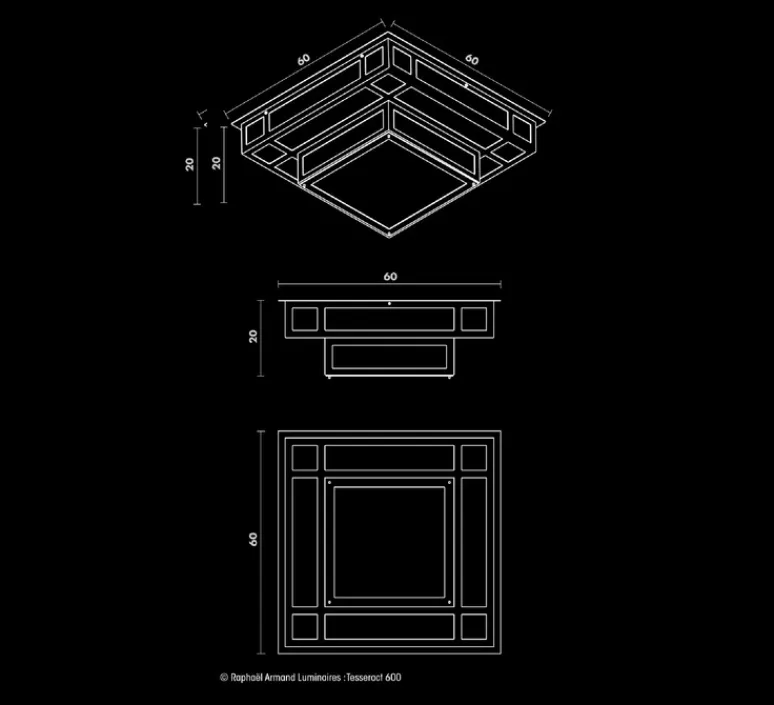 Tesseract 600 est un plafonnier de dimensions 60x60x15 cm, il convient dans une entrée ou aux pièces spacieuses. Raphaël Armand utilise pour ses luminaires du PMMA, un matériau bien plus résistant qui permet une transmission de la lumière plus importante qu’avec du verre.