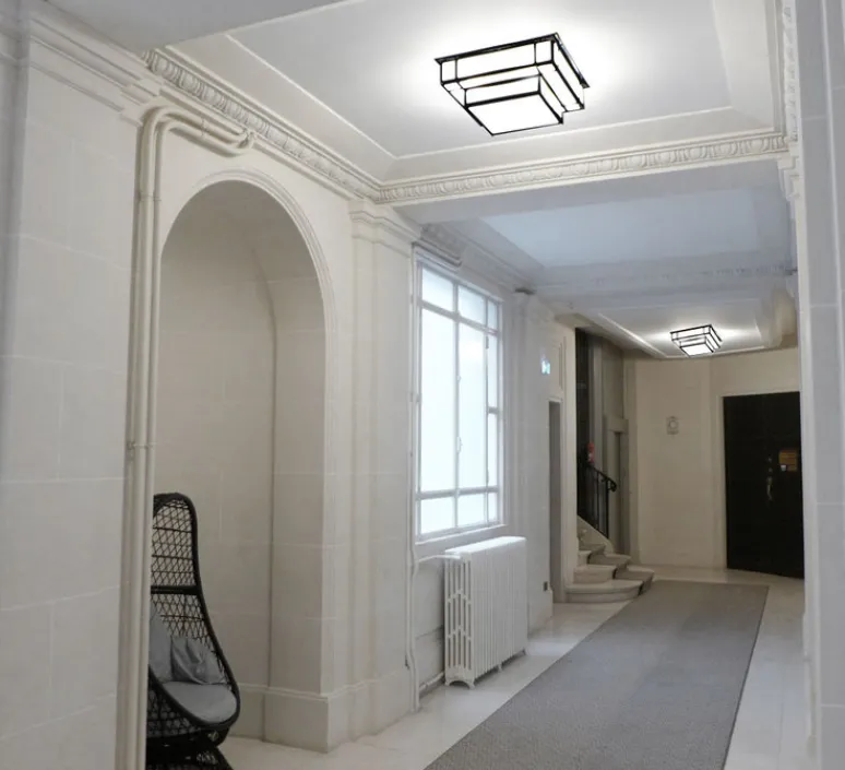 Tesseract 600 est un plafonnier de dimensions 60x60x15 cm, Il convient dans une entrée, ou aux pièces spacieuses.