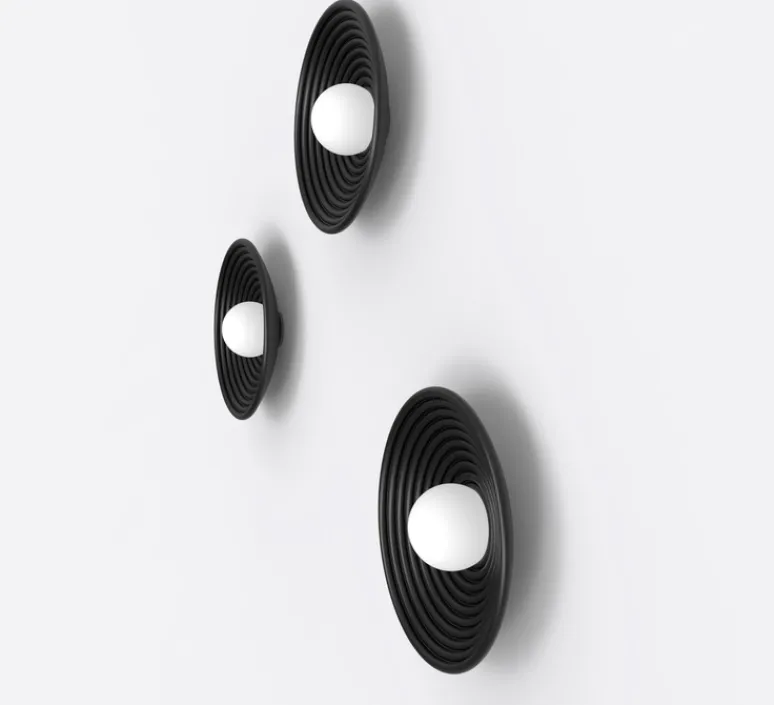 Conçue pour une installation murale ou au plafond, elle se présente comme une structure en aluminium circulaire avec un verre opalin en son centre. Son design graphique est adouci par le globe en verre en son centre, qui renferme la source lumineuse. Diffusant une lumière douce et enveloppante, elle apporte une touche de raffinement qui s’inspire d’un équilibre entre fonctionnalité et présence visuelle.