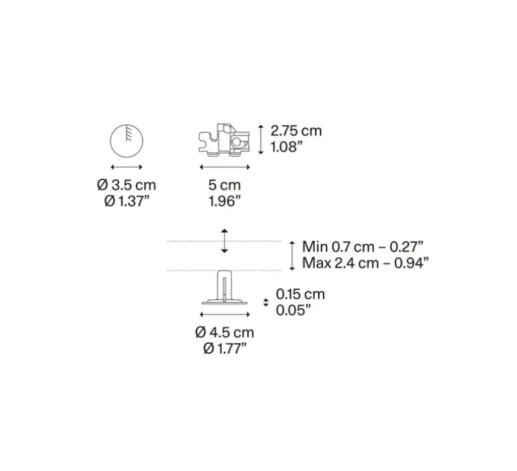 Ses dimensions apparentes sont de 4,5 cm de diamètre et de seulement 0,15 cm de hauteur. Grâce à ses dimensions et à sa couleur blanc mat, la rosace Recessed Micro est discrète et se fond harmonieusement dans votre plafond, mettant en valeur le luminaire suspendu. Compatible avec toutes les collections de la marque Lodes, cette rosace peut suspendre un luminaire pesant jusqu’à 3,5 kg.
