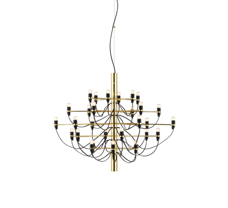 2097/30 est une suspension à lumière diffuse composée d’une structure centrale en forme de tube faite de fer, de laquelle partent trente bras en laiton, chacun accueillant une ampoule. 2097 a la silhouette d’un chandelier classique et une allure moderne. Raffiné et iconique, 2097 s’intègre dans tous les intérieurs, qu’ils soient privés ou publics, classiques ou modernes, que la suspension soit utilisée dans un salon, au-dessus d’une table ou dans une entrée.