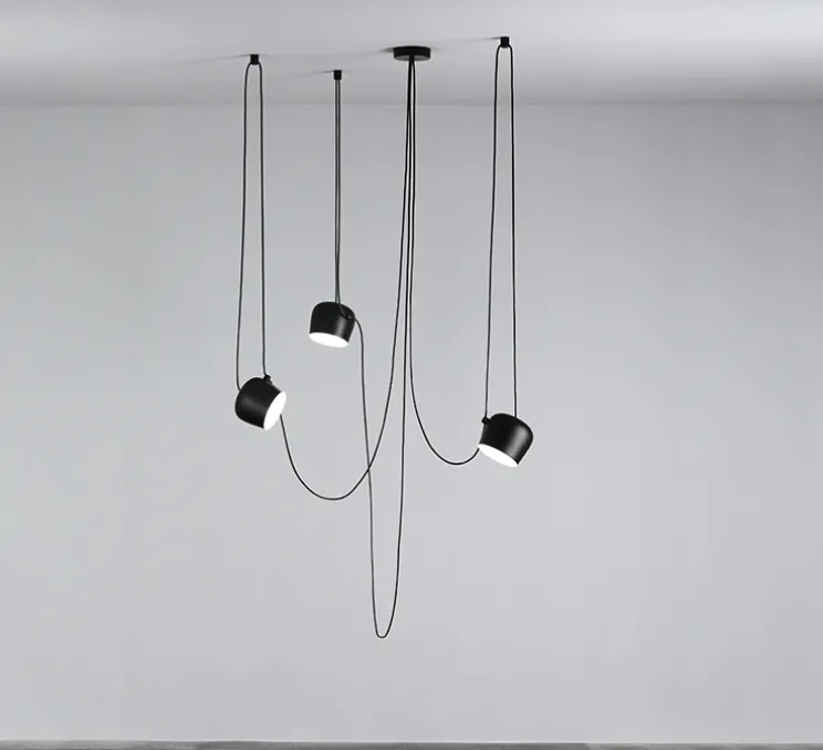 La suspension Aim est composée des deux éléments essentiels d’un luminaire : un diffuseur et un câble. En dessinant Aim, Erwan et Ronan Bouroullec s’inspirent de la nature et veulent créer un luminaire pouvant s’adapter à chaque utilisateur, chaque espace, chaque situation. Aim se positionne naturellement dans son environnement, sa tête orientable éclairant ses alentours. Individuellement ou en groupe, Aim crée une vibrante jungle de câbles, se développant telles les branches d’une plante grimpante, au grès des besoins de la vie. Grâce à ses longs câbles, Aim peut se placer n’importe où : dans un angle d’entrée, au centre d’un salon ou au-dessus d’une table à manger.