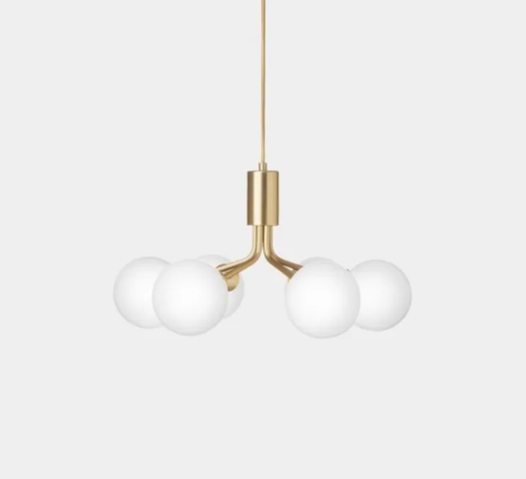 Sofie Refer s’est inspirée de la nature scandinave, les 6 bras de la suspension Apiales rappellent les tiges d’un bouquet d’où la lumière se diffuse gracieusement au travers des globes opalins en verre soufflés à la bouche.