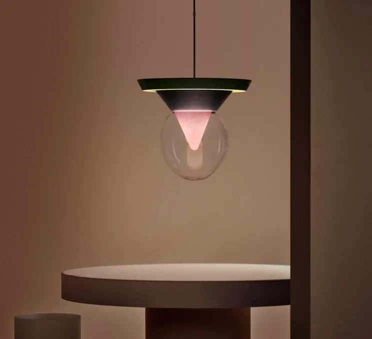Sa silhouette conique associe un verre transparent soufflé à la main, un entonnoir intérieur teinté rose, une céramique vert foncé mate et du bois vert clair laqué mat. La palette de couleurs, douce mais affirmée, met en valeur la force tranquille qui se dégage de Bia. Suspendue au-dessus d’un îlot central, dans un salon ou un hall d’entrée, elle affirme une présence sculpturale et diffuse une lumière enveloppante, idéale pour créer une atmosphère sereine et habitée.