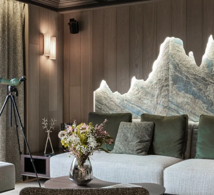 La structure métallique de Black Note en finition noire, s’harmonise avec ses abat-jour lumineux et chauds en placage de bois gris.
