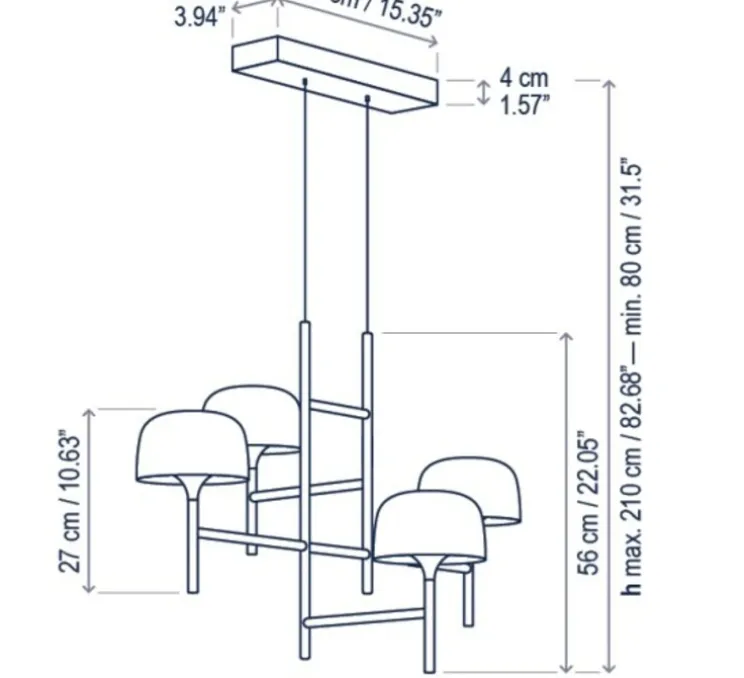 La suspension mesure 83cm de longueur pour 56cm de hauteur. Les 4 sources lumineuses sont fournies.