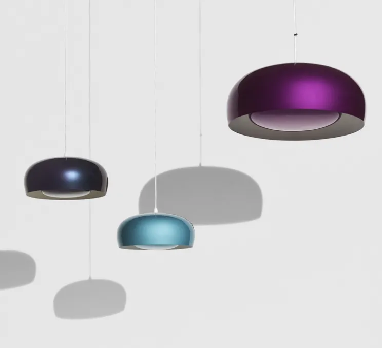 Pour obtenir cette couleur spéciale et éclatante, il est primordial de la cuir en plusieurs étapes afin d’atteindre la profondeur métallique des couleurs. La peinture utilisée pour la suspension bleue et violette provient de pigments susceptibles de réagir à la cuisson. Quant à la couleur irisée, elle provient d’une base de nacre broyée, ce qui donne cet aspect iridescent. Ce travail minutieux permet à la couleur de prendre corps en trois dimensions, autrement dit, du haut vers le bas du luminaire. La forme arrondie de la suspension découle d’une technique de repoussage de l’aluminium réalisée manuellement. Par la suite, l’abat-jour est perforé au laser afin d’y positionner la pastille dans la coupole sans colle ni soudure.