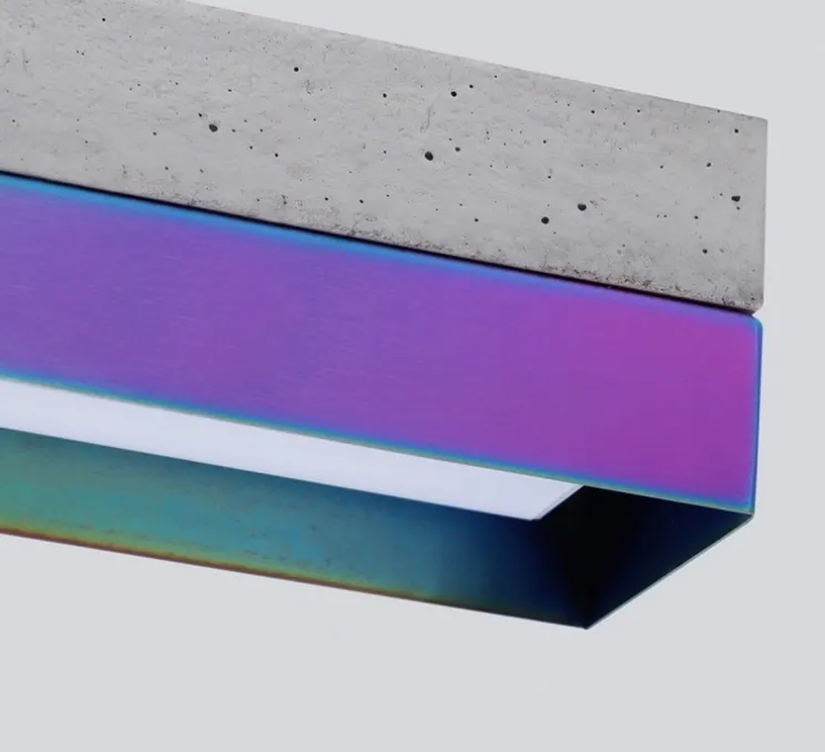 Inspirée de l’arc-en-ciel, la suspension C1 irisée accroche le regard. Conçue en béton et en acier inoxydable irisé, le luminaire dispose de la technologie Touch Dim qui permet de régler l’intensité de la lumière en touchant les câbles en acier.