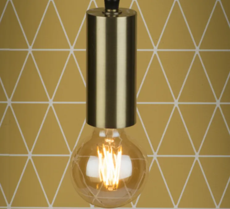 La suspension est en métal. Les dimensions sont de 5 cm de diamètre et 10 cm de hauteur. L’ampoule n’est pas fournie : E27, max 60W. Le câble en tissu noir mesure 250 cm. Les dimensions de la rosace dorée sont de 11,5 cm de diamètre et 2,5 cm de hauteur.