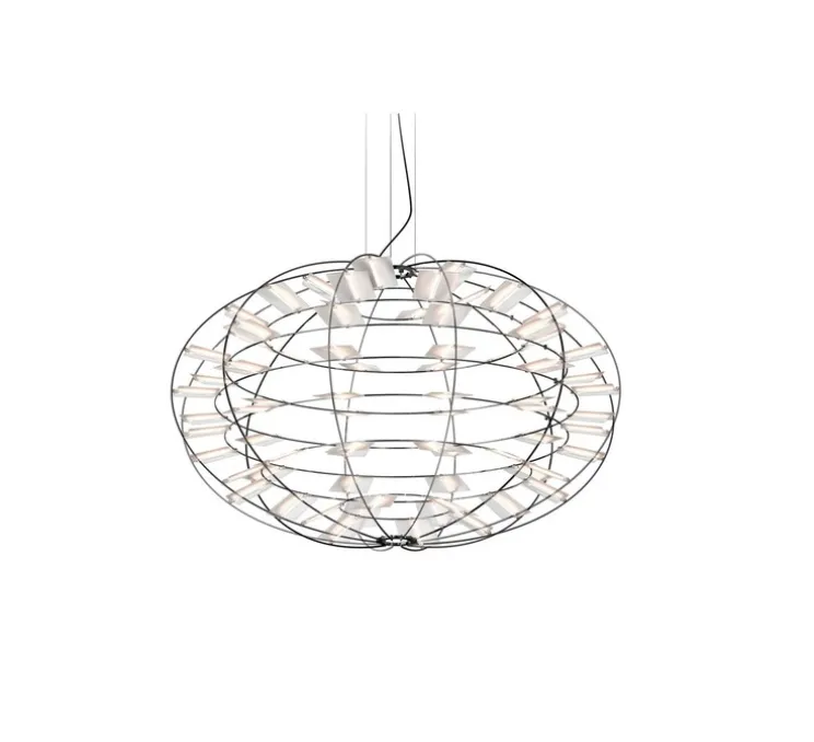 Avec ses finitions en blanc et nickel, Chloris présente un design sphérique élégant et aérien, qui s’impose comme un point focal dans tout espace. Les diffuseurs en polycarbonate flottent subtilement dans l’air, entourés d’une structure conductrice qui abrite des LED individuelles, diffusant une lumière douce à 360 degrés. Idéale pour les grandes pièces à vivre ou les salles à manger, elle crée une ambiance lumineuse unique, subtilement graphique et sans stridences.