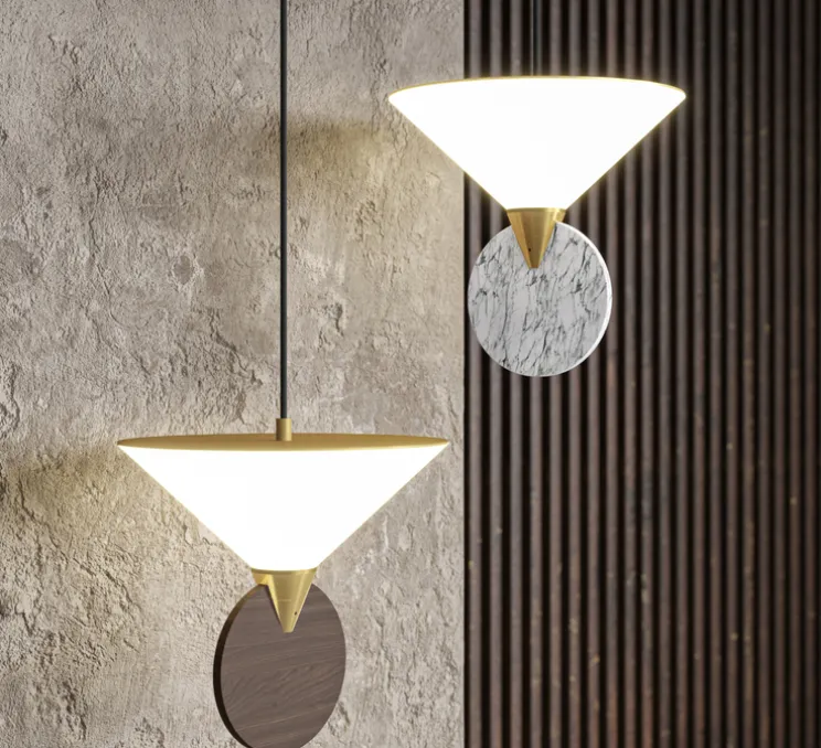 La collection Compass offre une association harmonieuse entre le marbre et le noyer massif. Imaginée par la designer française Emilie Cathelineau, la suspension possède un embout avec un module LED posé sur une base en noyer massif, un bois noble et précieux reconnu pour sa belle teinte saturée. La suspension Compass présente une sculpture flottante et apporte une lumière subtile grâce à un verre opalin soufflé à la bouche