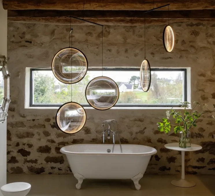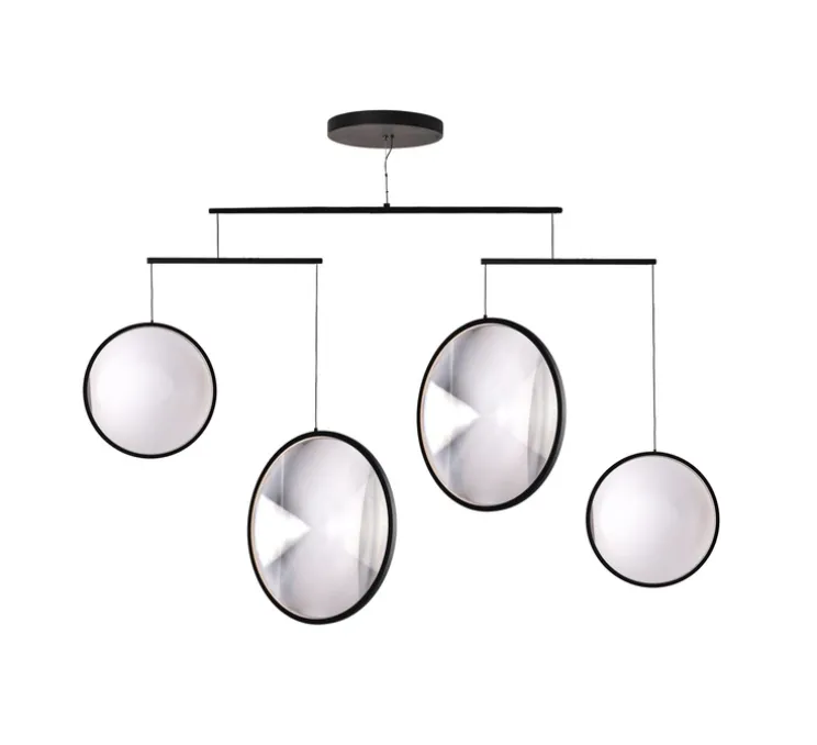 Les planètes ne sont-elles pas des bulles de savon qui n’auraient jamais éclaté dans leur voyage ? À force d’observer avec sa lunette d’astronomie, Yuji les a apprivoisées, pour les faire flotter dans une atmosphère légère. La suspension se compose de 4 lentilles cerclées de métal noir. La lumière est émise sur tout le contour de la lentille et se diffuse sur toute la surface transparente pour créer un jeu de lumière fascinant.